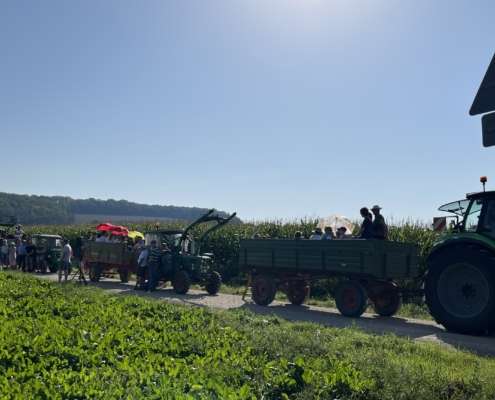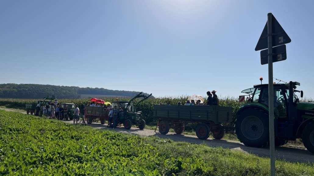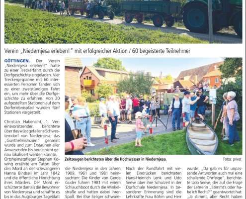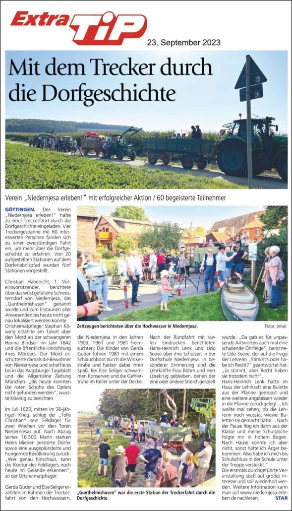 Am 10.09.2023 lud der Verein Niedernjesa erleben! e.V. zu einer Treckerfahrt durch die Dorfgeschichte ein. Vier Treckergespanne mit 60 interessierten Personen fanden sich zu einer 2-stündigen Fahrt ein, um mehr über die Dorfgeschichte zu erfahren. Von 20 aufgestellten Stationen auf dem Dorferlebnispfad wurden 5 Stationen vorgestellt.